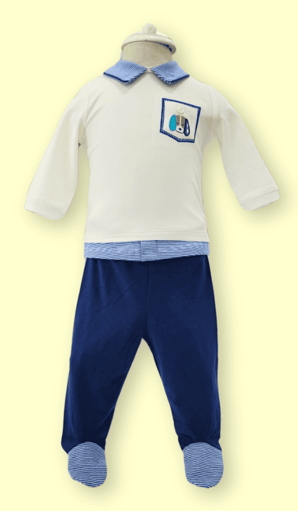 Este conjunto para bebé niño es perfecto para mantenerlo abrigado y con mucho estilo. La camiseta de manga larga en color blanco con cuello camisero a rayas azul y un divertido bordado de avioncito en el bolsillo, combina con el pantalón azul marino con piecitos cubiertos y detalles a rayas.
