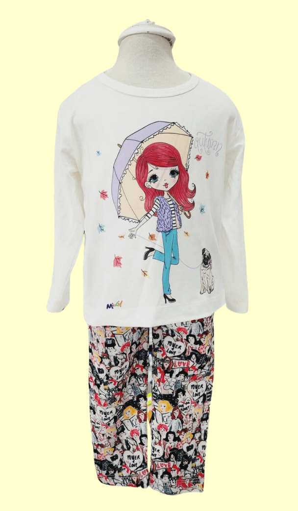 Este dinámico conjunto para niña incluye una chaqueta acolchada con capucha que viene en dos opciones de color metalizado: un llamativo rosa fucsia metalizado o un moderno plata metalizado. Ambas opciones de chaqueta son acolchadas para proporcionar calidez y un estilo contemporáneo, y cuentan con un forro interno suave y peludito (posiblemente sherpa o polar) para mayor confort, además de una cremallera frontal para facilitar su uso. Complementando la chaqueta, una camiseta de manga larga en color blanco con una encantadora ilustración de moda de una niña estilizada con un paraguas y hojas de otoño, acompañada de un perrito. Esta camiseta añade un toque artístico y femenino al atuendo. Para completar el look, un pantalón con un estampado vibrante y divertido de múltiples caricaturas o personajes en un estilo pop art, junto con palabras como “POWER” o “LOVE” en blanco y negro, con toques de color. Este pantalón asegura un estilo único y una comodidad para niñas ideal para el juego. Este conjunto es ideal para ropa de niña con brillo, moda infantil vanguardista, y un excelente regalo para niñas que buscan un outfit original y cómodo. Las chaquetas son perfectas para el otoño/invierno infantil, mientras que la camiseta y el pantalón son versátiles para todo el año.