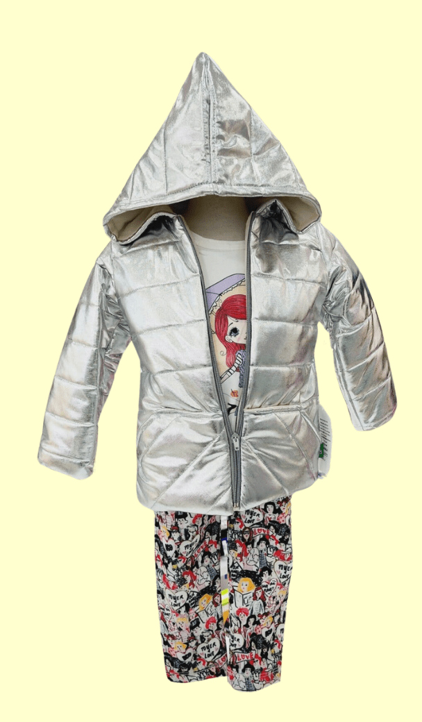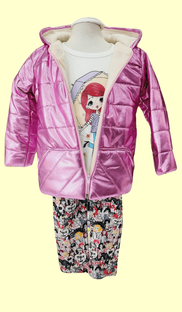 Un conjunto audaz y divertido para niñas. Incluye una chaqueta acolchada metalizada (disponible en rosa o plata), camiseta con ilustración de moda y pantalón estampado vibrante. Ideal para moda infantil moderna, ropa de niña con estilo y looks llamativos.